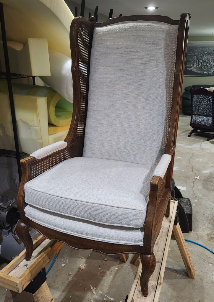 Grandpa chair: BEFOREGrandpa chair: AFTER (02/2026)Fireside chair (12/2025)Chair and ottoman (11/2025)Beanbag cover and stools (11/2025)Sofa (07/2025)New cushion covers (04/2025)Recliner: interior and arms (04/2025)Giant armchair (02/2025)4 chairs to go with the leather ones (09/2024)Chair and ottoman (09/2024)Recliner in two pieces (08/2024)Pair of parsons chairs (07/2024)Wingback in ikat print fabric (07/2024)Stools with covered legs (06/2024)Brown leather chair (05/2024)Floral Channelback (04/2024)Beige loveseat (2/2024)Headboard (09/2023)Rocking chair set (06/2023)Deep button tufting (03/2023)Floral wingback (10/2022)Eastlake style loveseatGreen wingbackCornice boards
